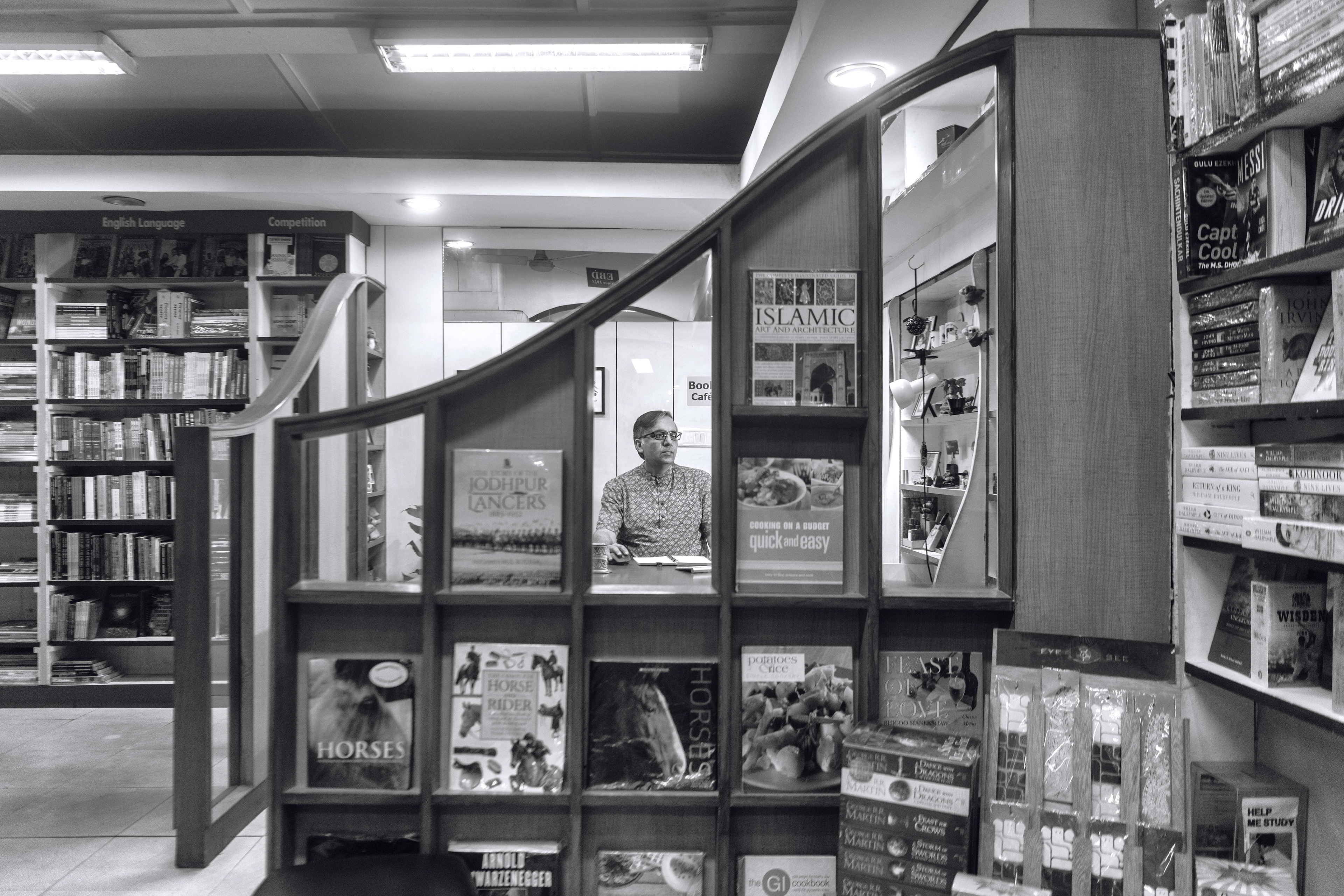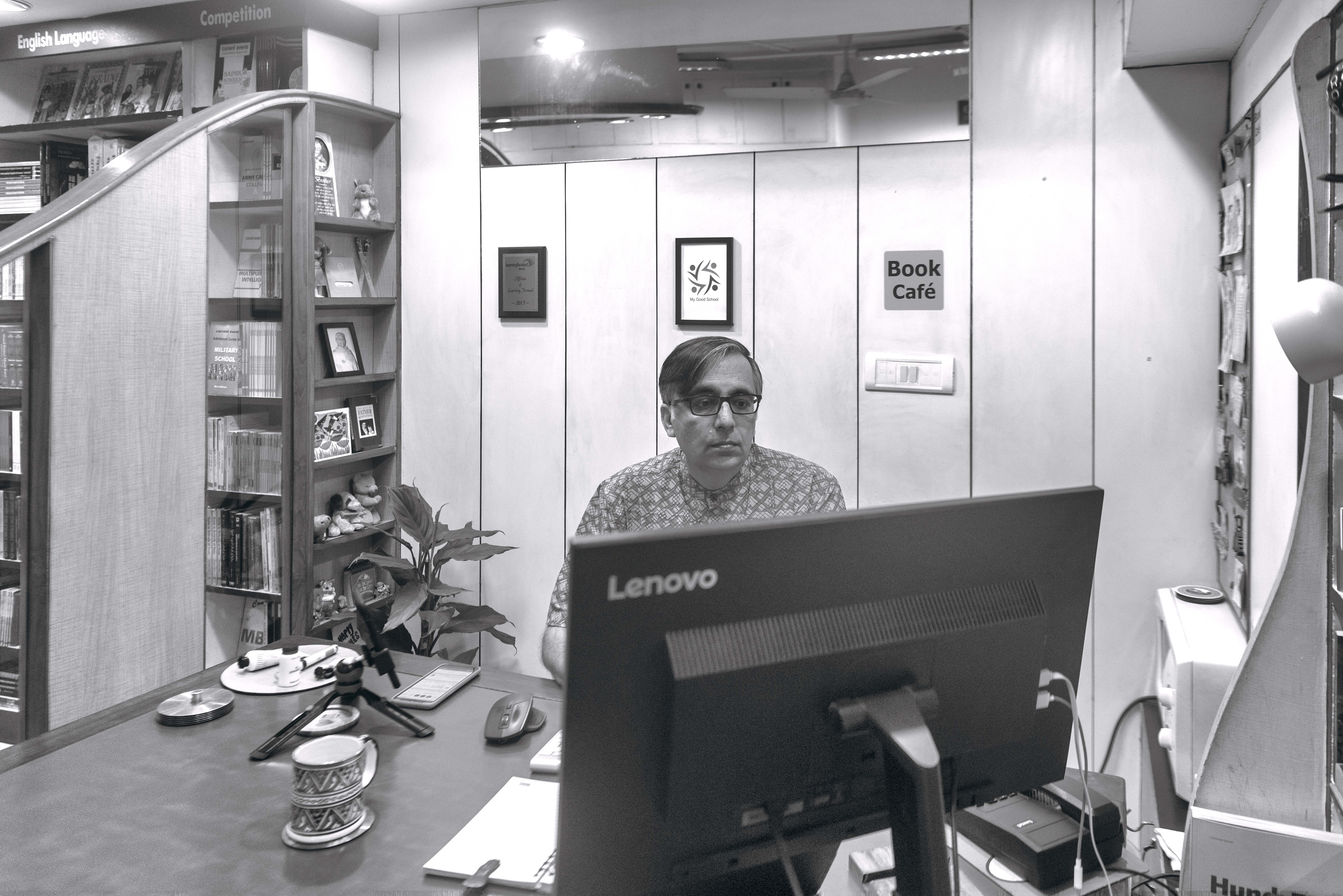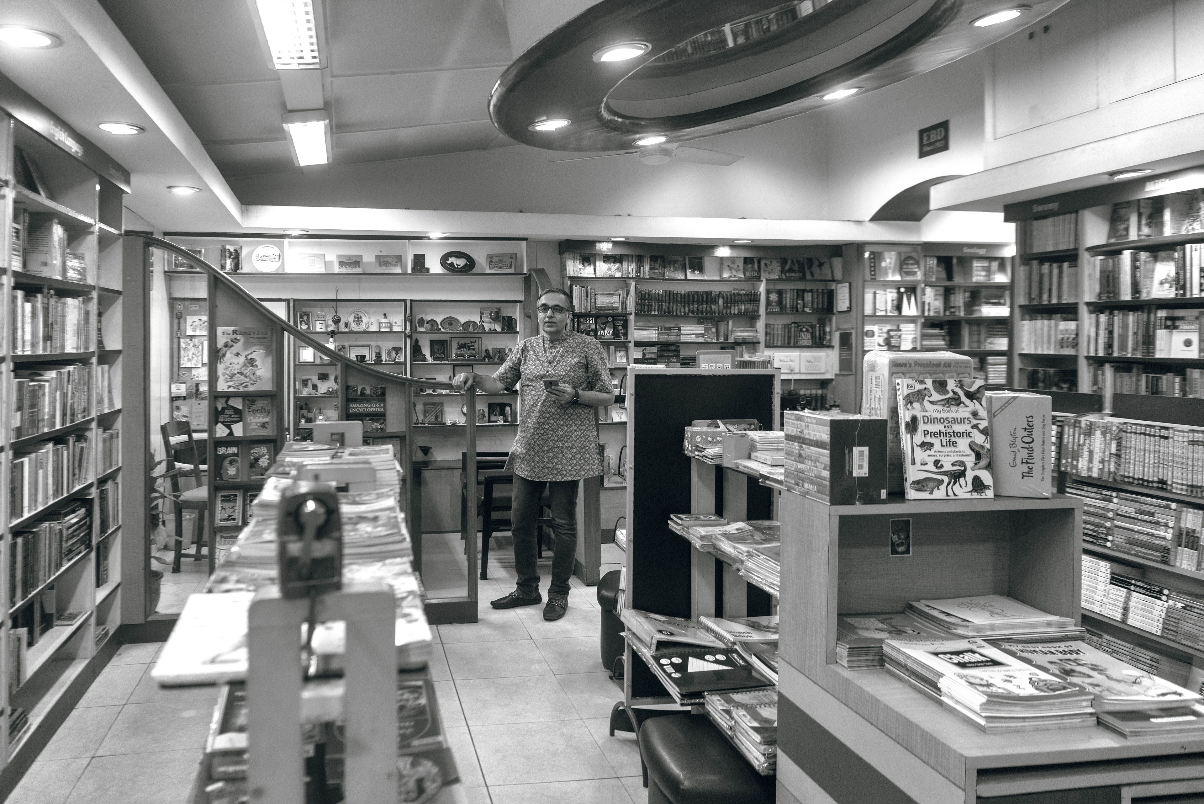 Sandeep sits in the last cabin of the store, surrounded by the children's book section, an area he works in as well, apart from running the administration of , "The English Book Depot".