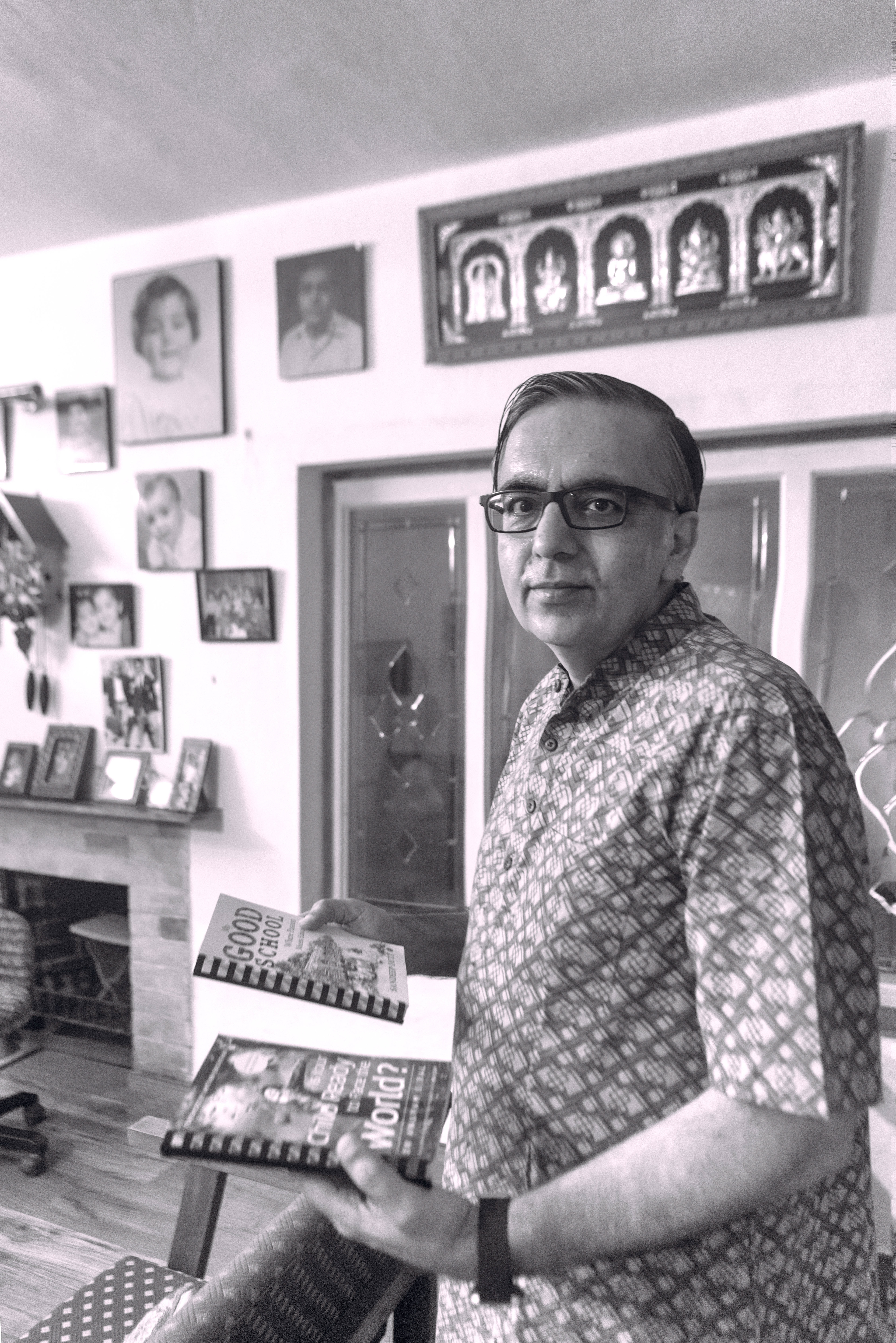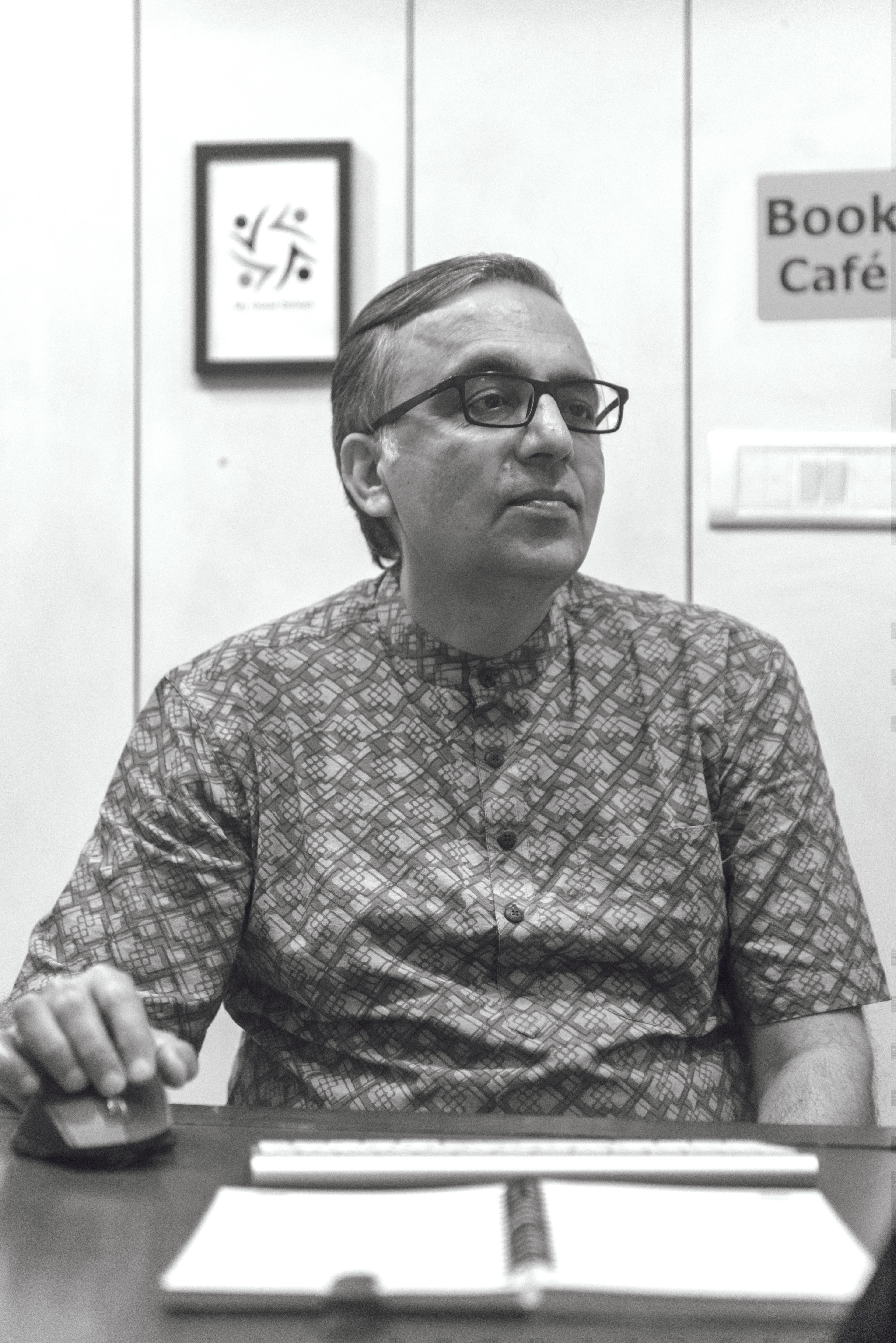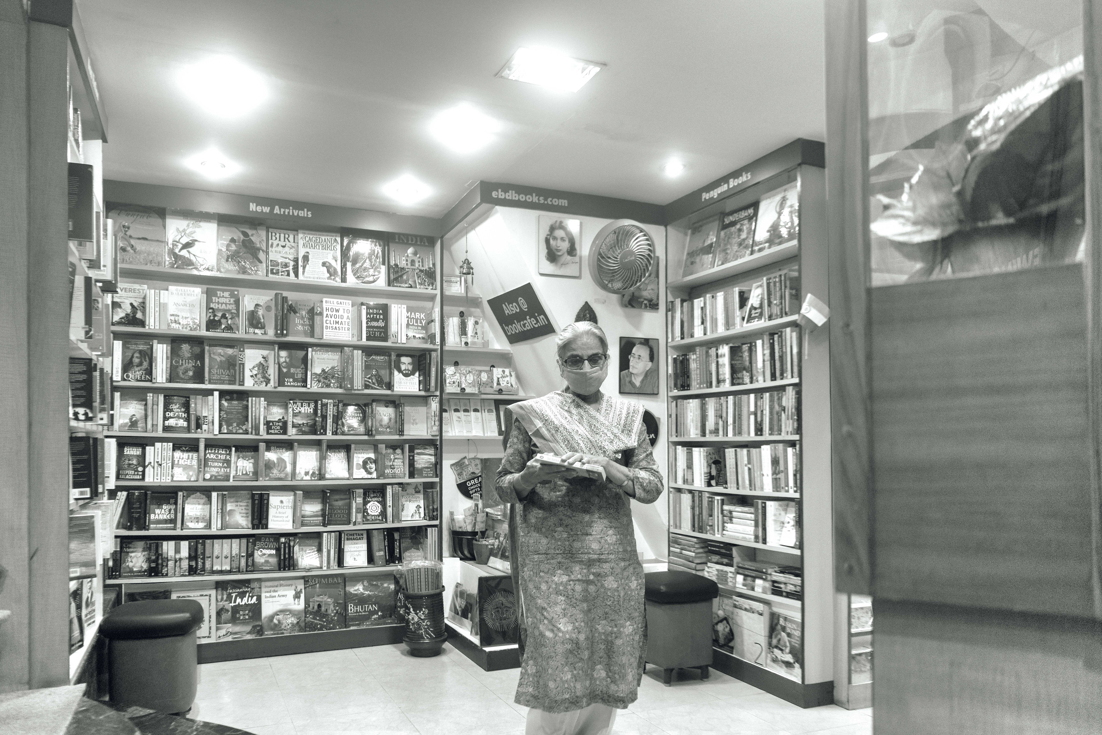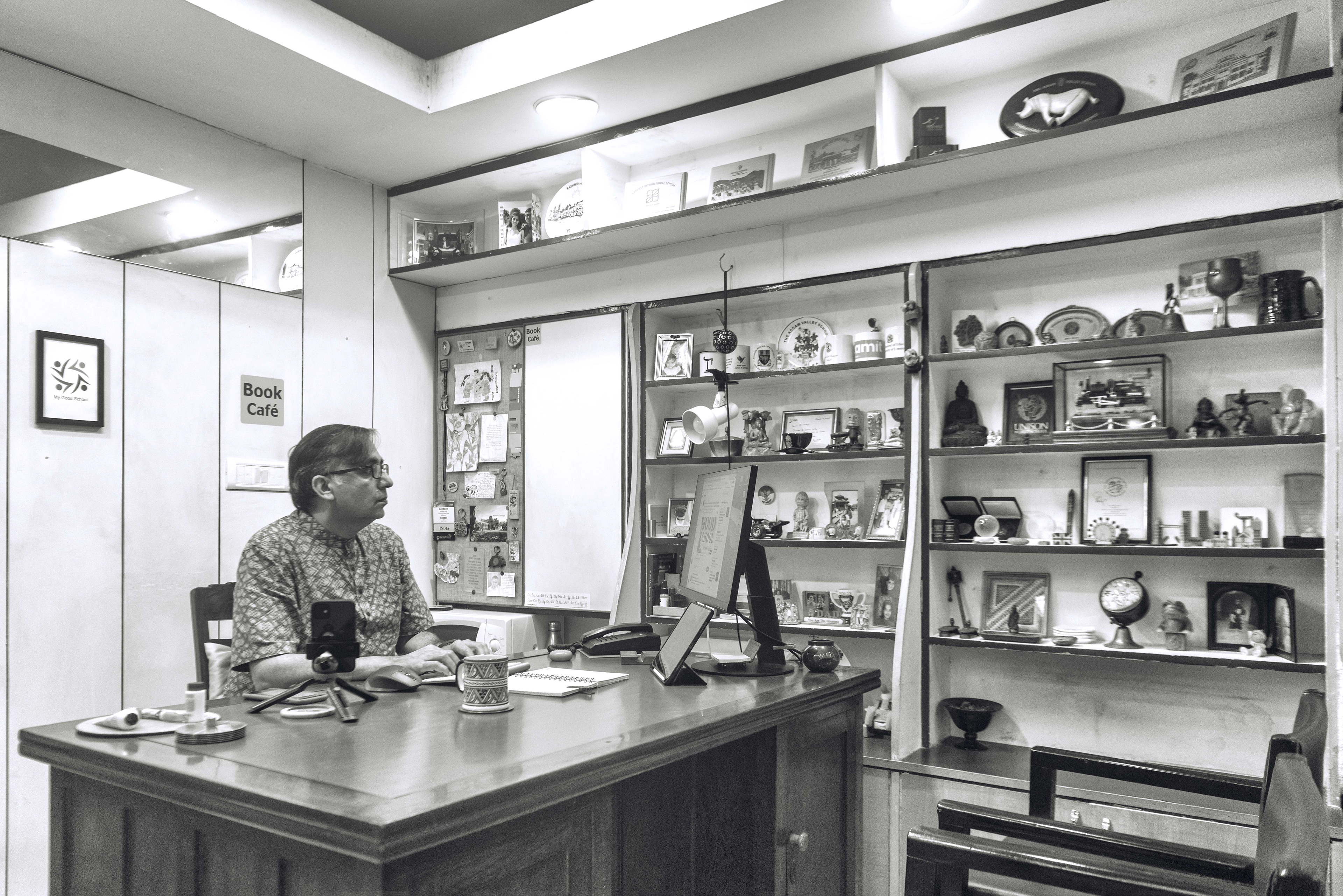 Sandeep sits in the last cabin of the store, surrounded by the children's book section, an area he works in as well, apart from running the administration of , "The English Book Depot".