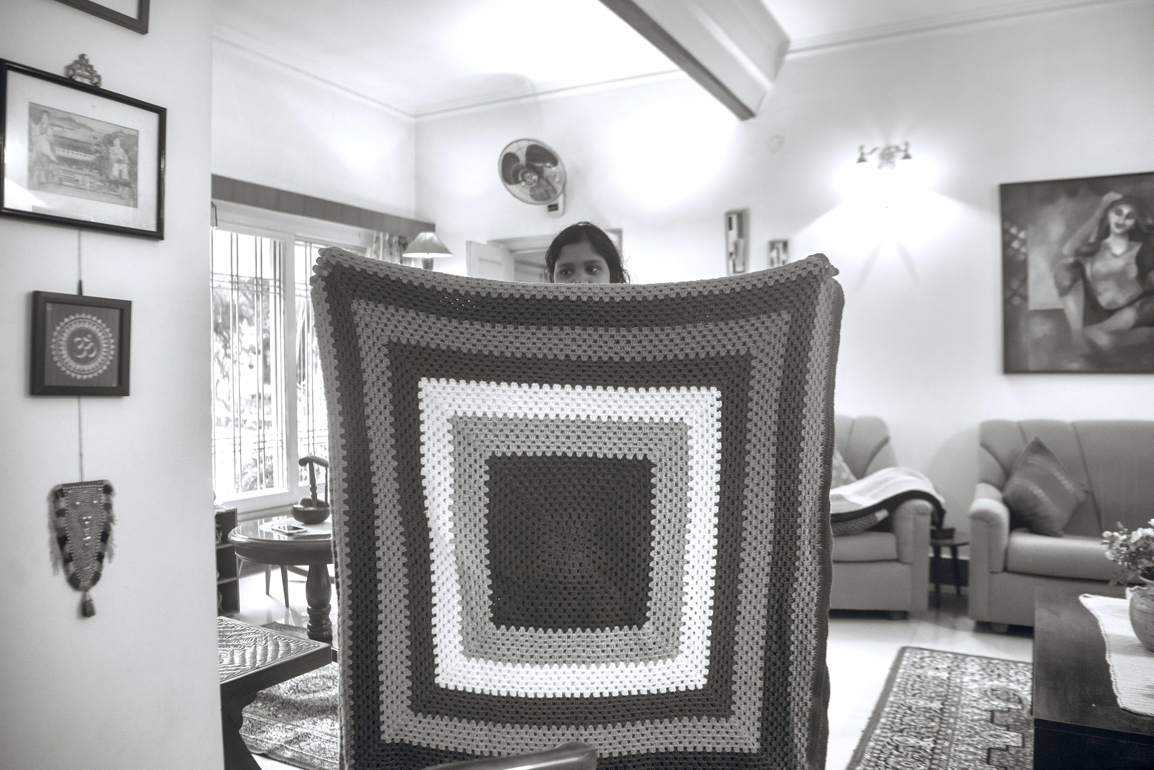 As promised over our last conversation on the call, She called in her house help, and showed me a variety of woollen bedsheets, table cloth and bed covers she had knitted over a span of three years since we last met.